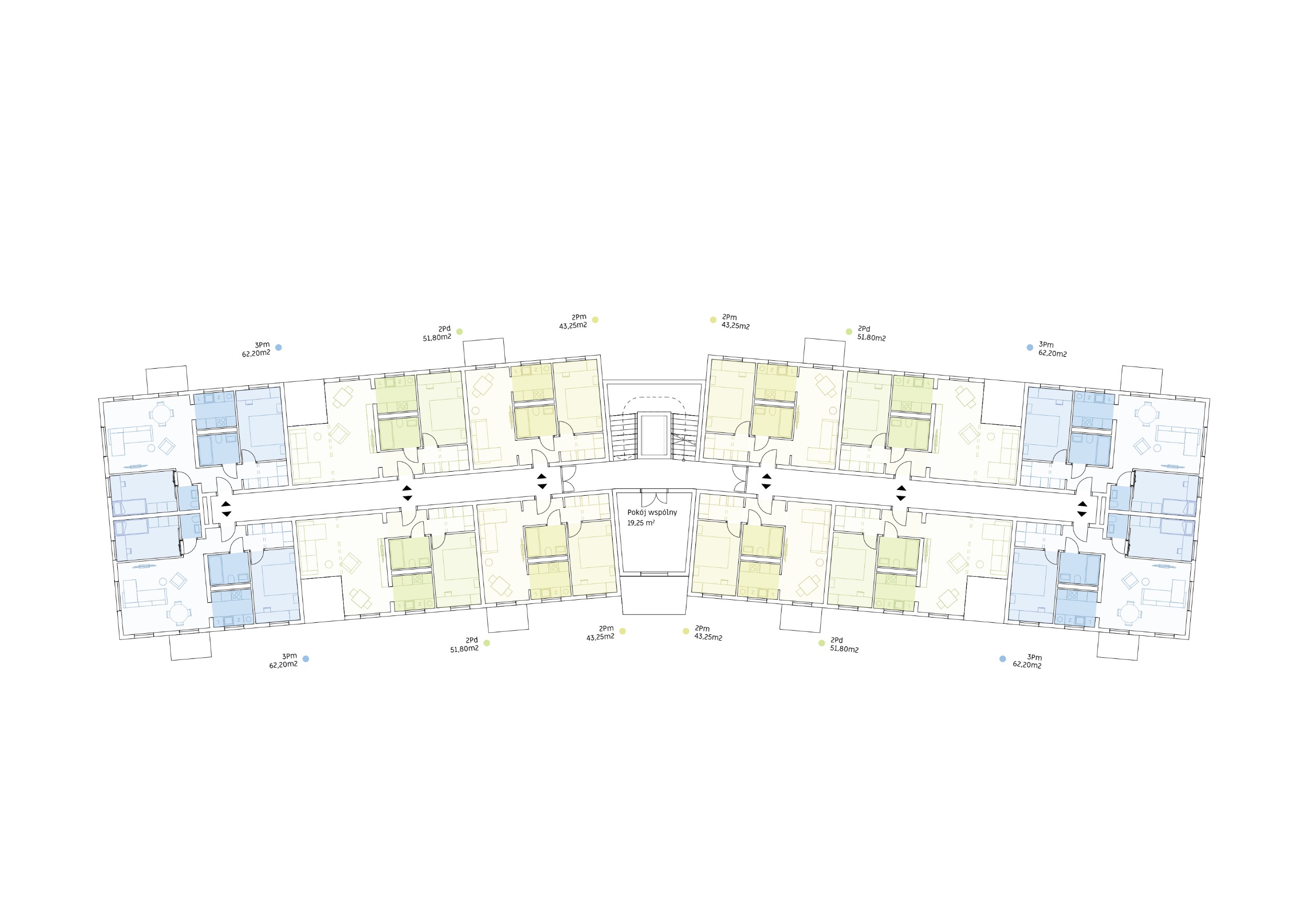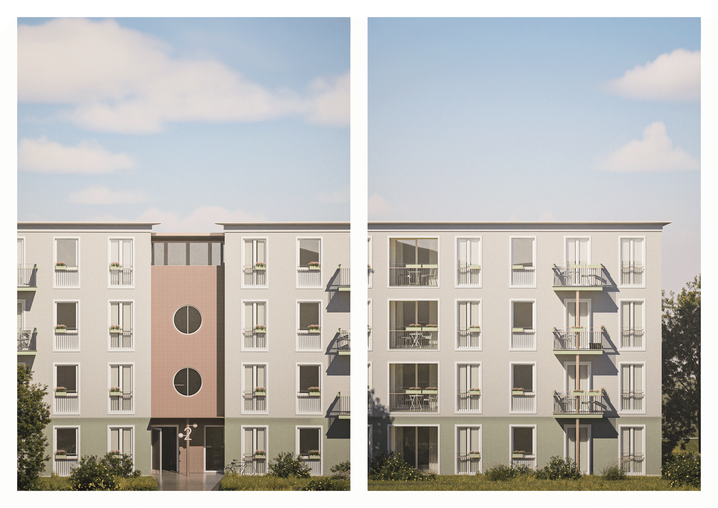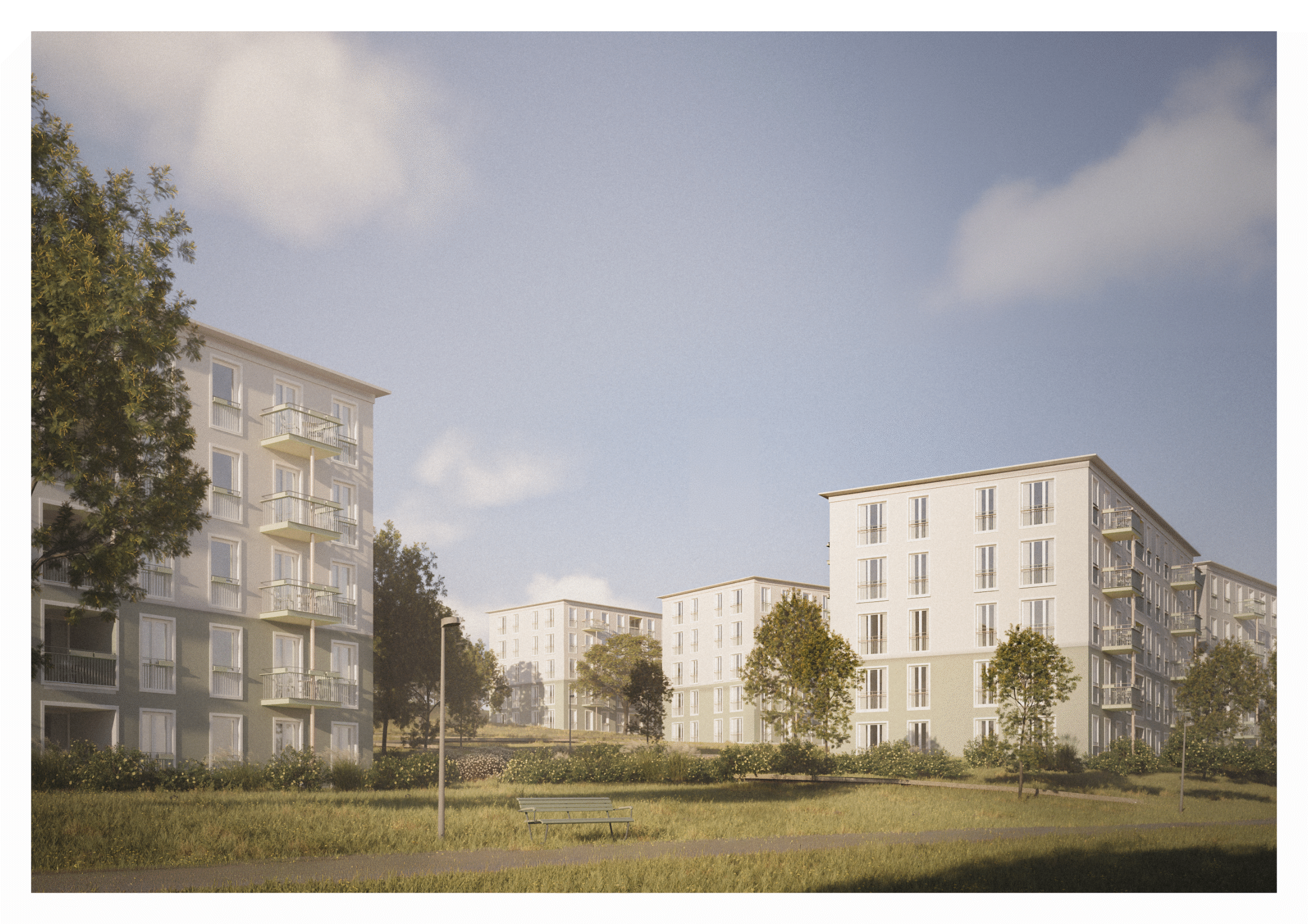 A modular and repeatable building system ensures high economic efficiency, while maintaining spatial quality and a clear urban structure. The architecture is based on simple, durable materials and a subtle interplay of rhythm, color, and texture.