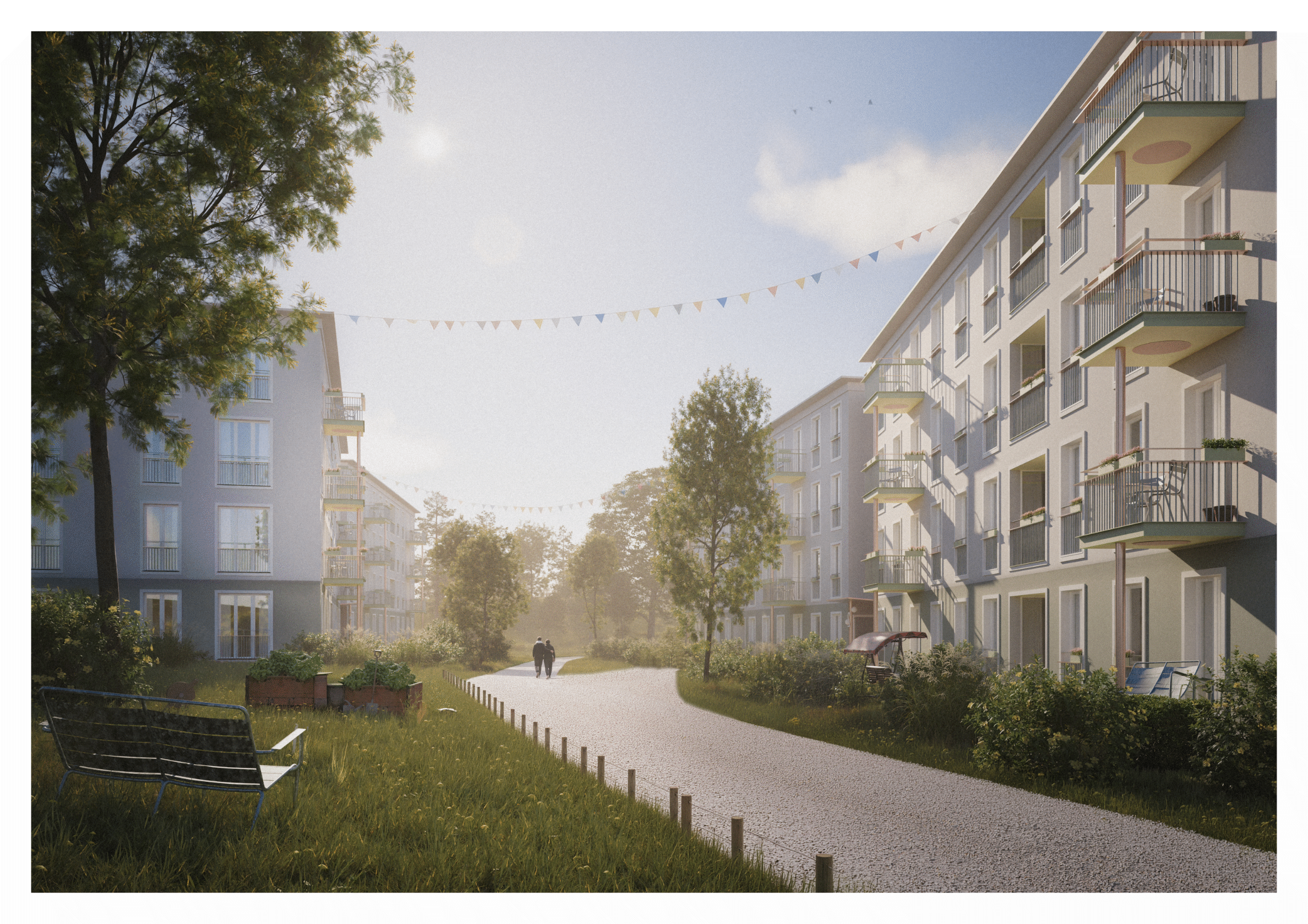 At its core, the design introduces semi-public courtyards—spaces for meeting, interaction, and everyday life. The result is a sustainable, phased development that provides a calm background for living and evolves in harmony with its surroundings.
