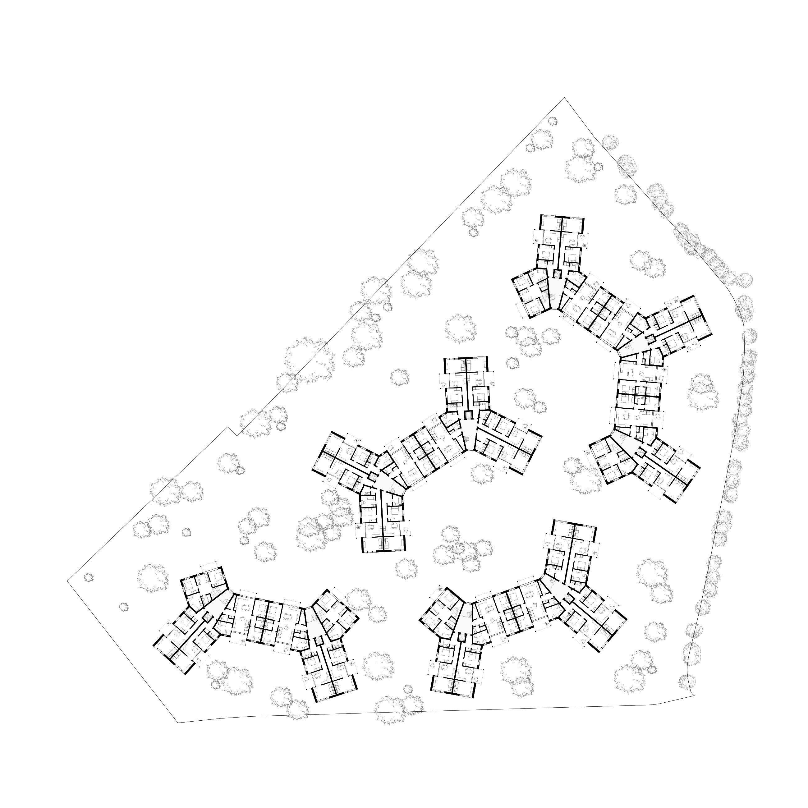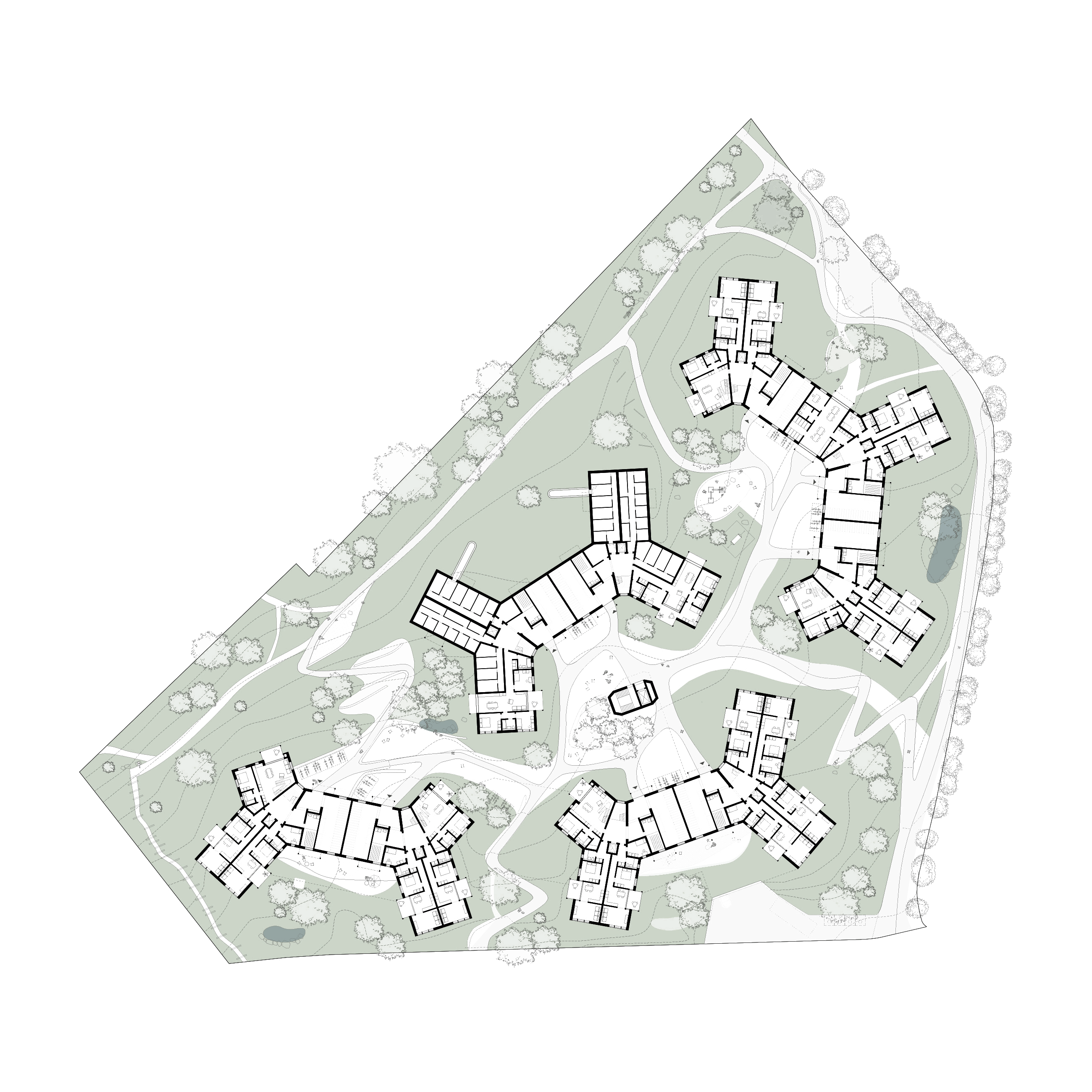 The Espenwis residential project features angled building structures that create new sheltered spaces and pathways on a sloping site. The design utilizes a networked modular pattern, optimally adapted to the site, which distinguishes it from the surrounding independent typologies. The development integrates with the new Stephanshorn Park and nearby walking paths, creating a generous green space that responds to the topography of the drumlin, an ice age relic. The staggered positioning of modules enhances views, ensures transparency, and allows for cold air flow.