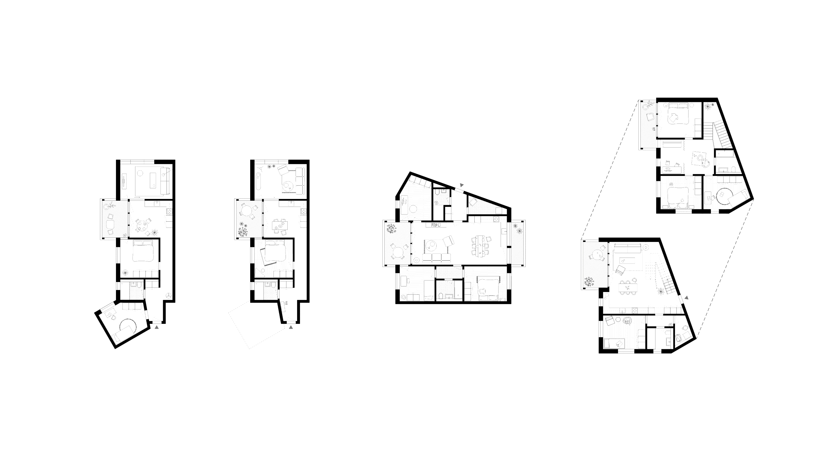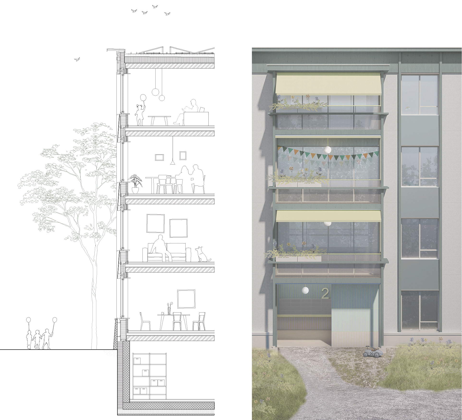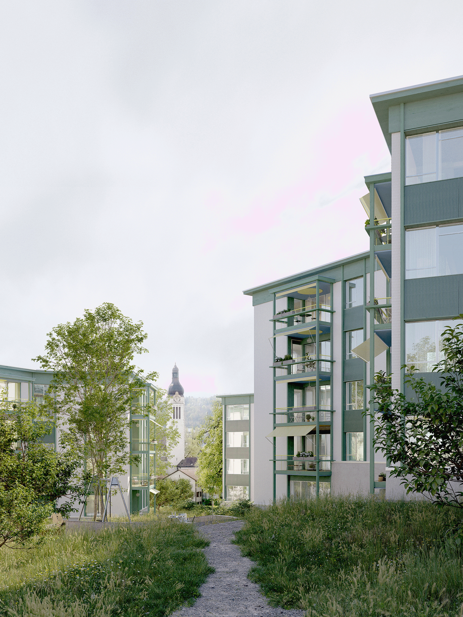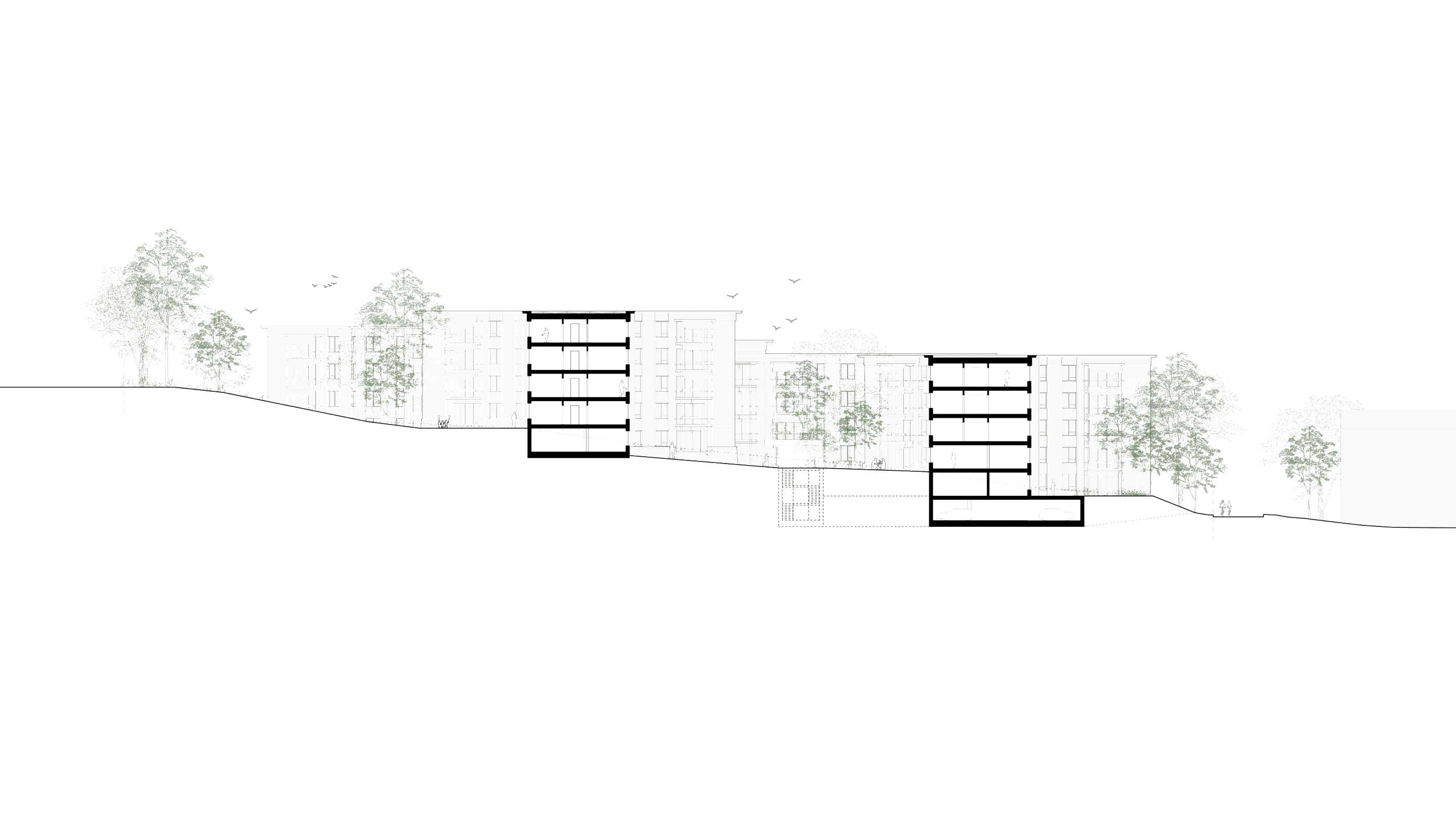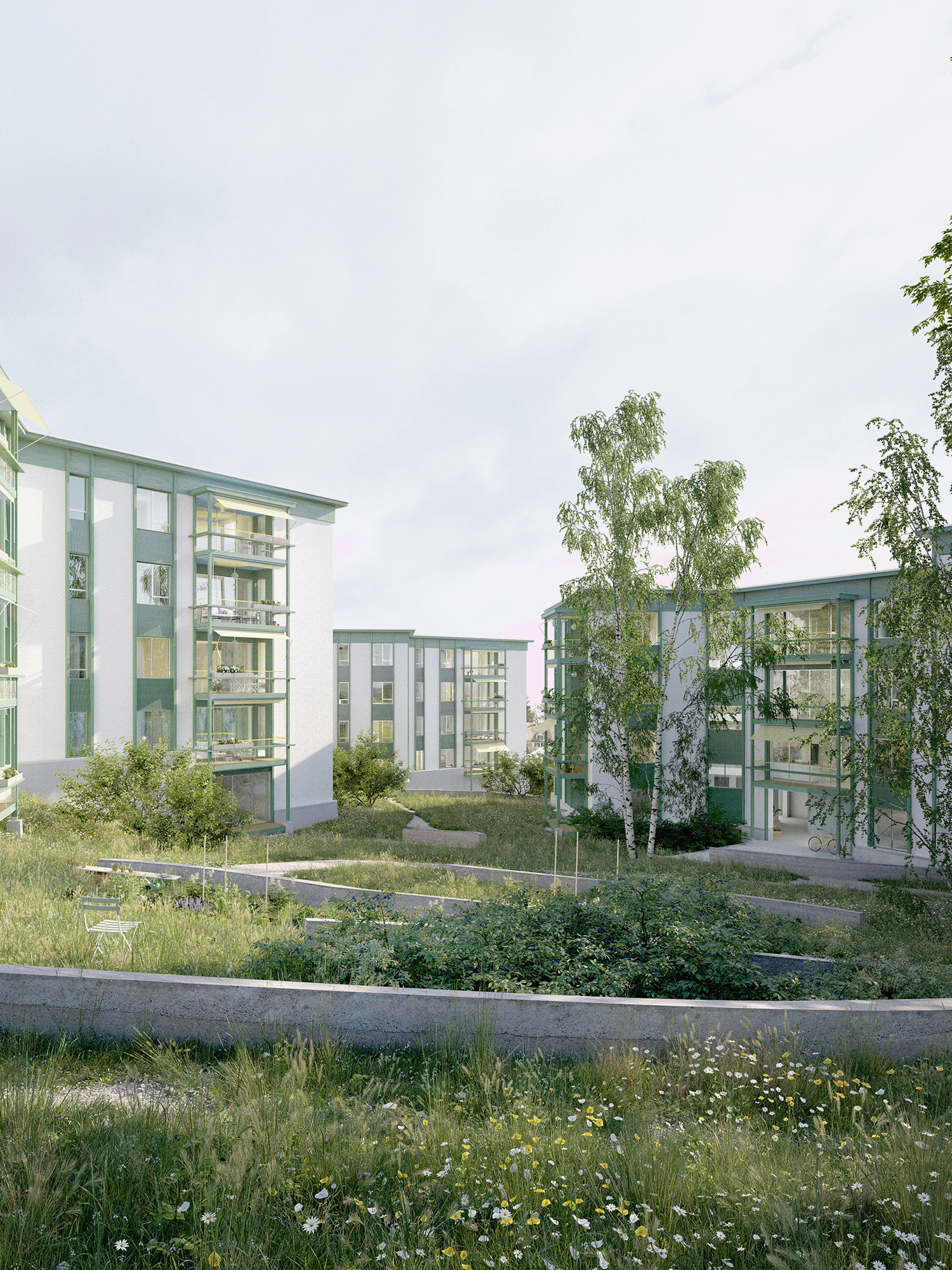 Located on a traditional orchard hillside, the site preserves its distinctive topography as a key landscape element. Nesting opportunities on buildings and rich habitats promote biodiversity. Ground intervention is minimal, limited to necessary access and communal spaces, while permeable surfaces improve water drainage and microclimate. Pathways meander through fruit trees and shrubs, leading to scenic viewpoints at the drumlin peak, emphasizing a slow, mindful experience. Expanded gravel paths serve as small plazas and emergency access routes, while gravel islands with varied compositions reflect underlying geological sediments. These spaces, with multi-stem pioneer trees and ruderal plants, create engaging play and social areas, fostering a sense of community and well-being.
